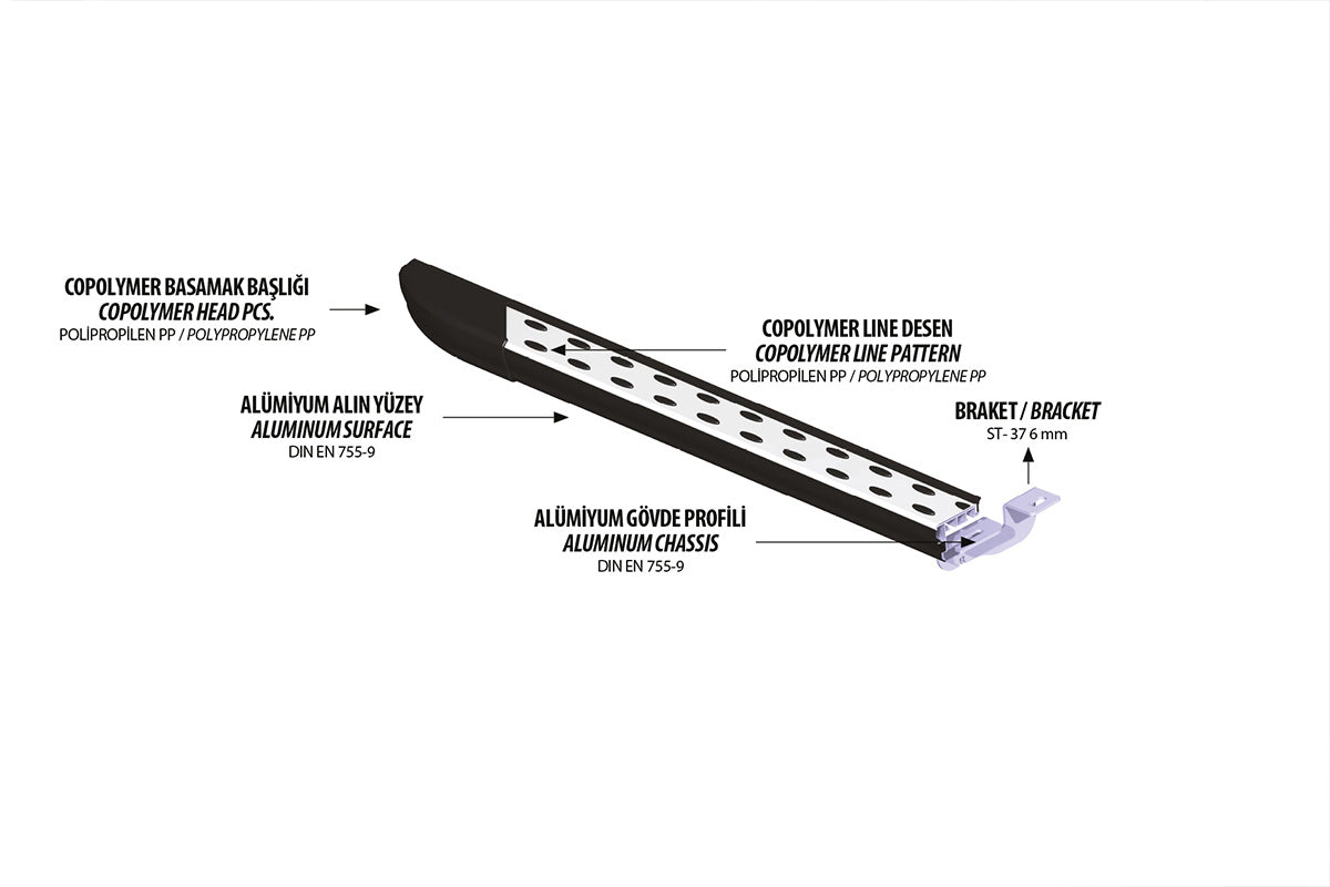 - Gövde hazırlanırken, Alüminyum malzemeye verilen şekil sayesinde basamaklar yüksek mukavemet oluşturur. Alüminyum malzemenin kendi direncine ek olarak yapının verdiği ekstra koruma direnciyle, basamak görevi görmesinin yanı sıra aracınızı darbelere karşı maksimum düzeyde korur.